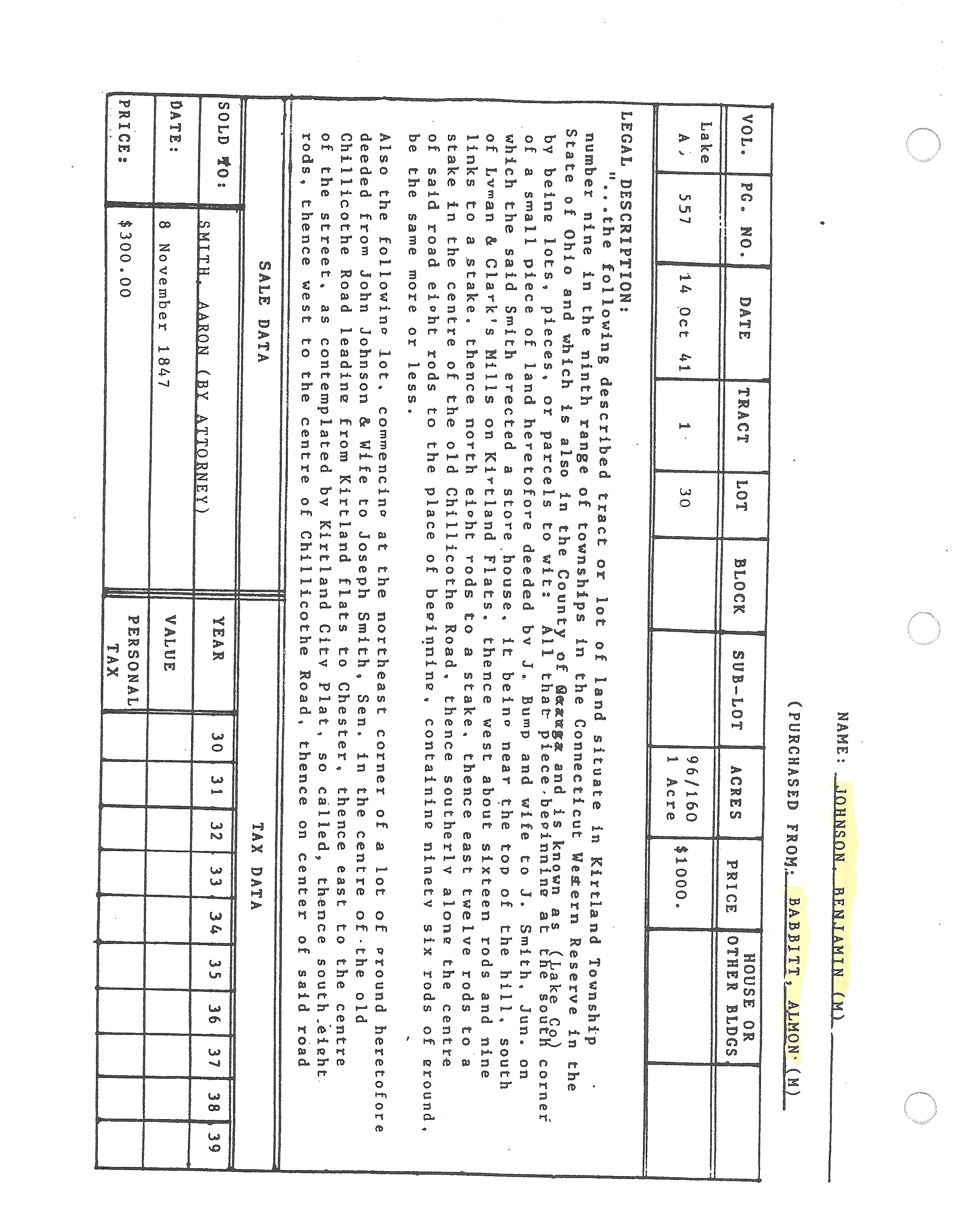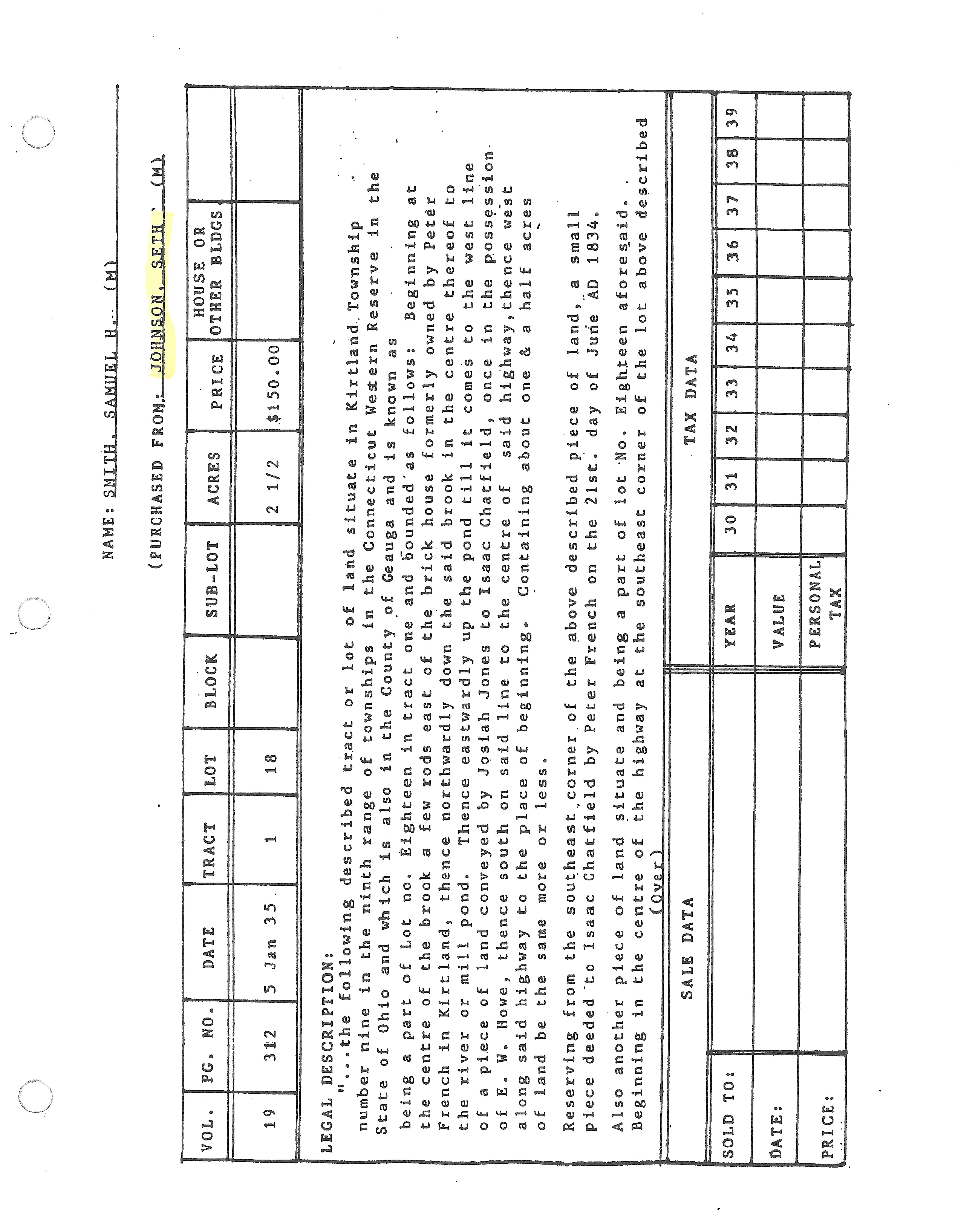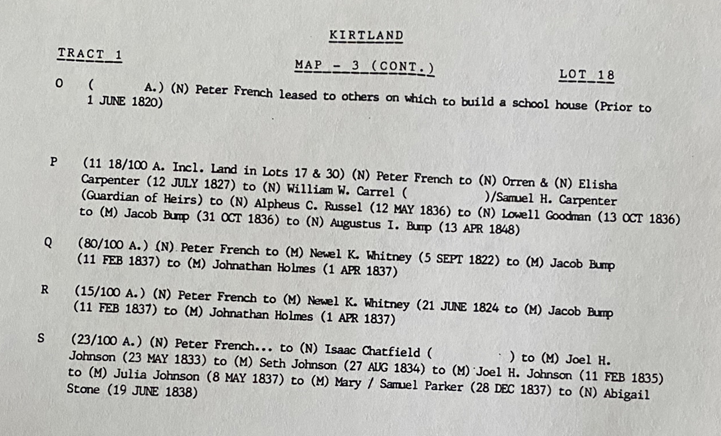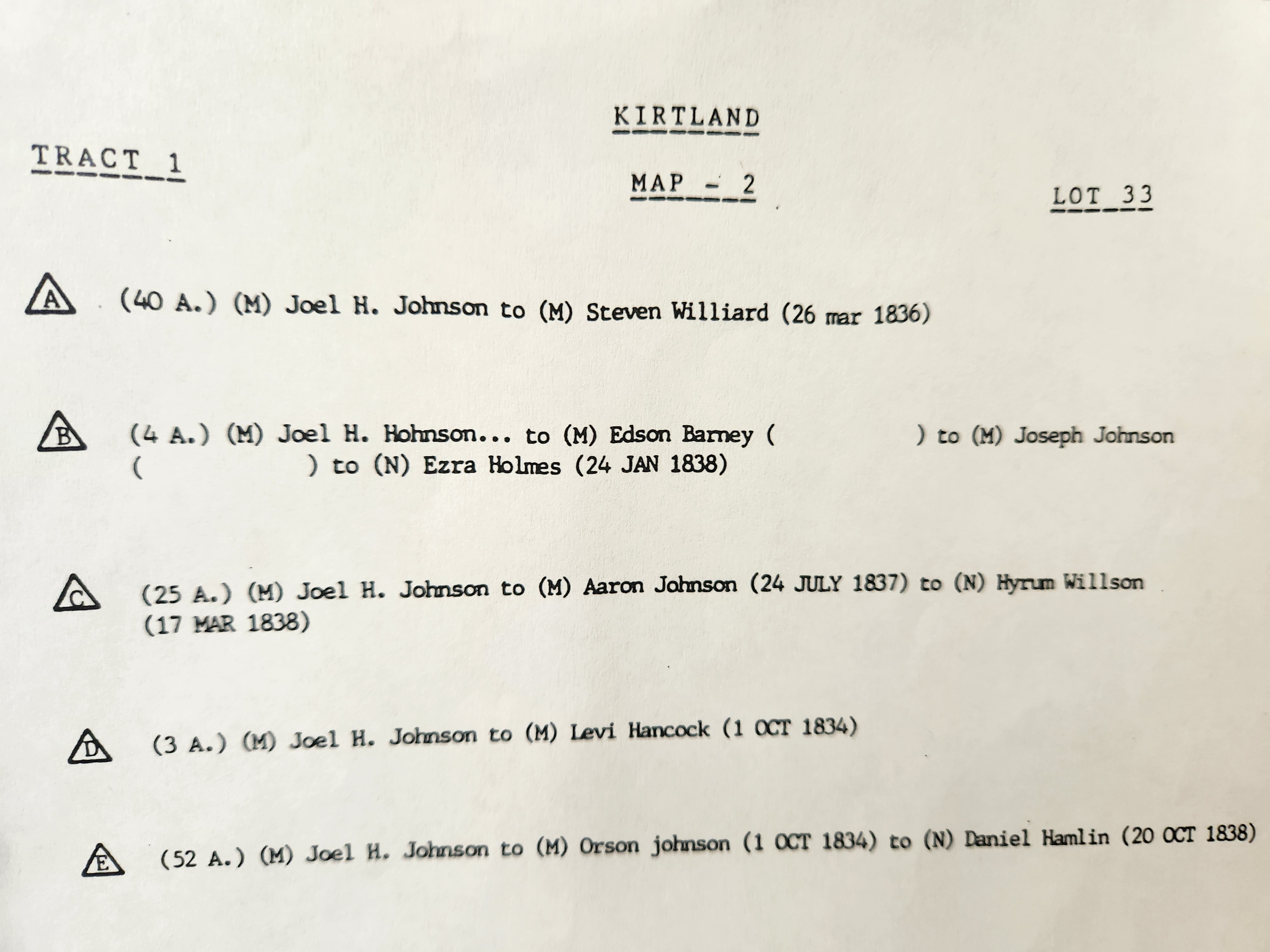 # 15. Lot 18 sub-lots D and J were bought by Seth Johnson in 1833. BF wrote that when Julia and her children arrived in Kirtland, “Some of our wagons and teams were traded for a home on what was then called ‘Kirtland Flat’ close to the schoolhouse.” These parcels are immediately to the north of the parcels which Joel had purchased. On 5 Jan 1835.shortly before Seth’s death, he sold this property to Samual H. Smith