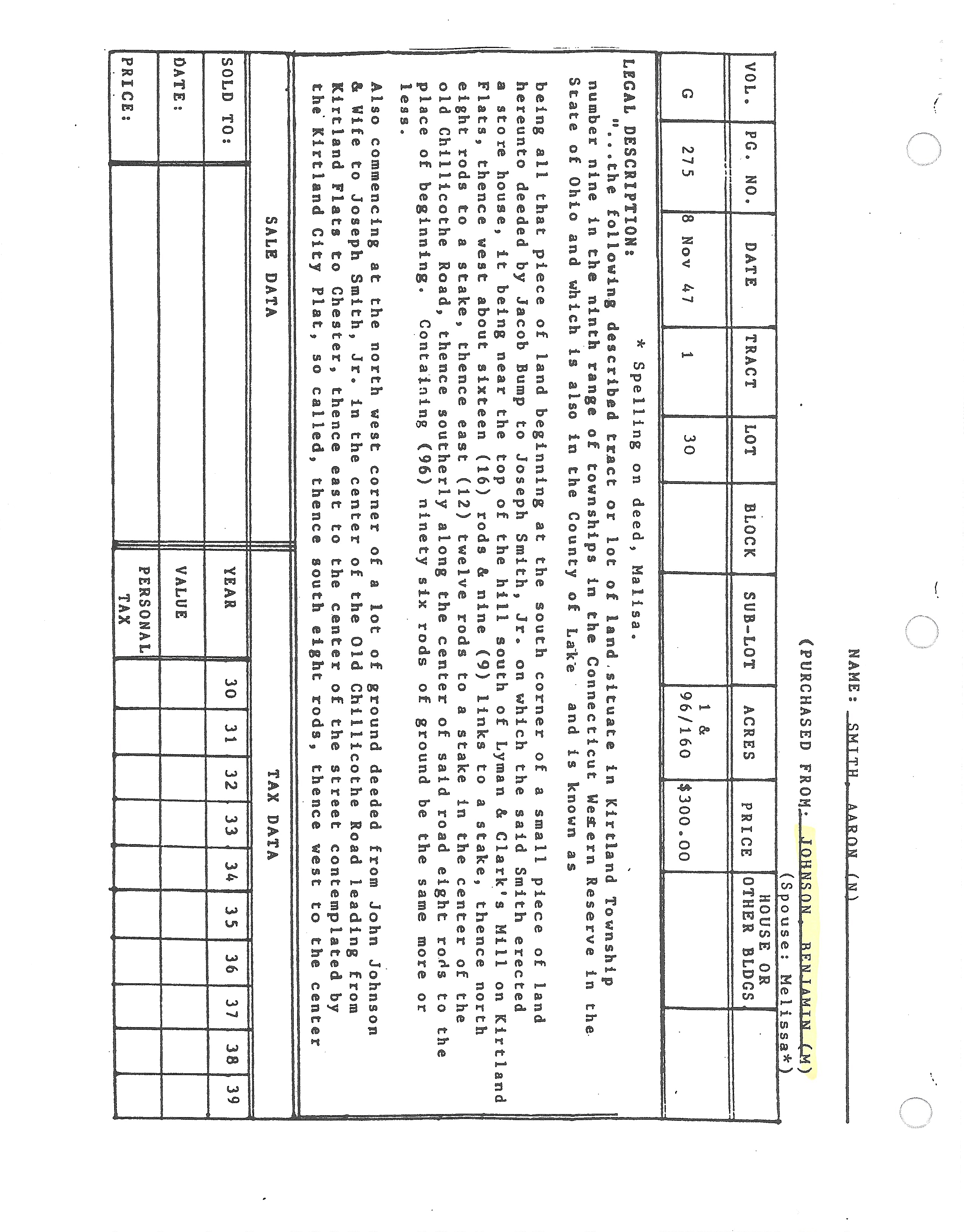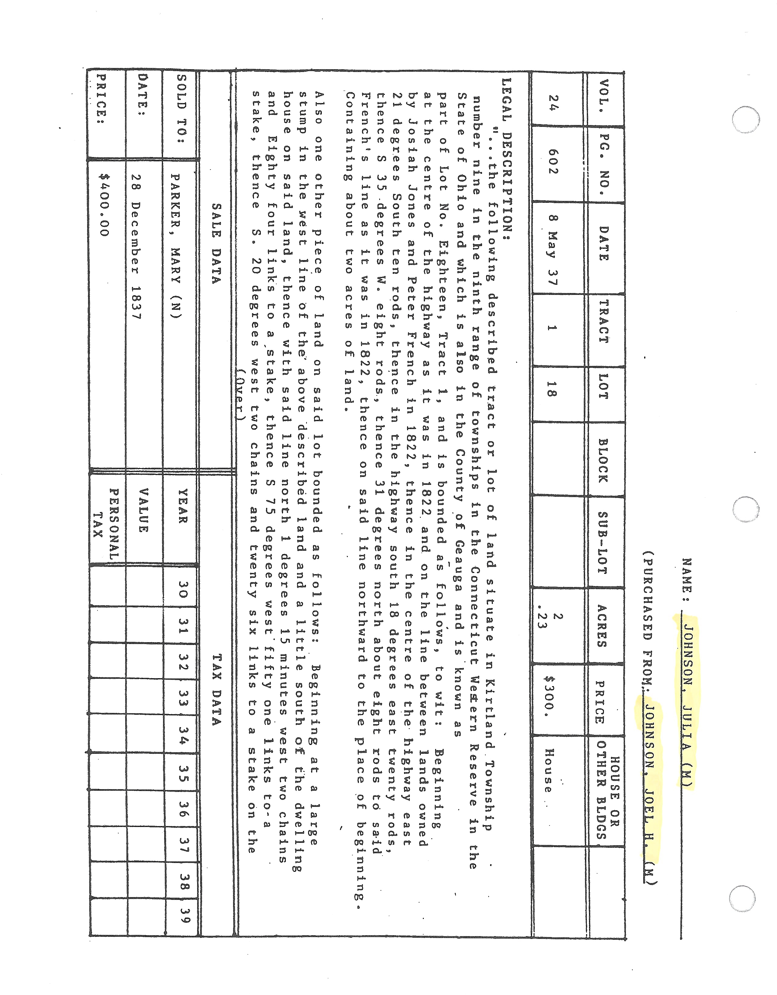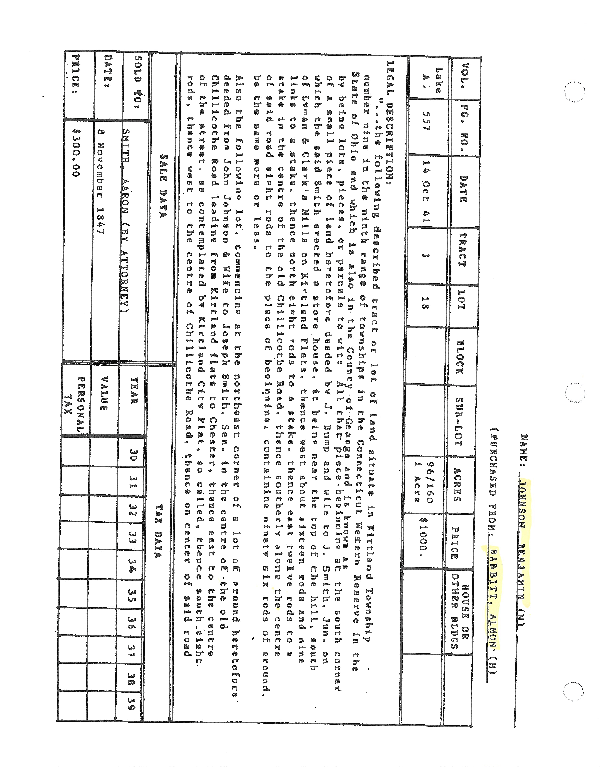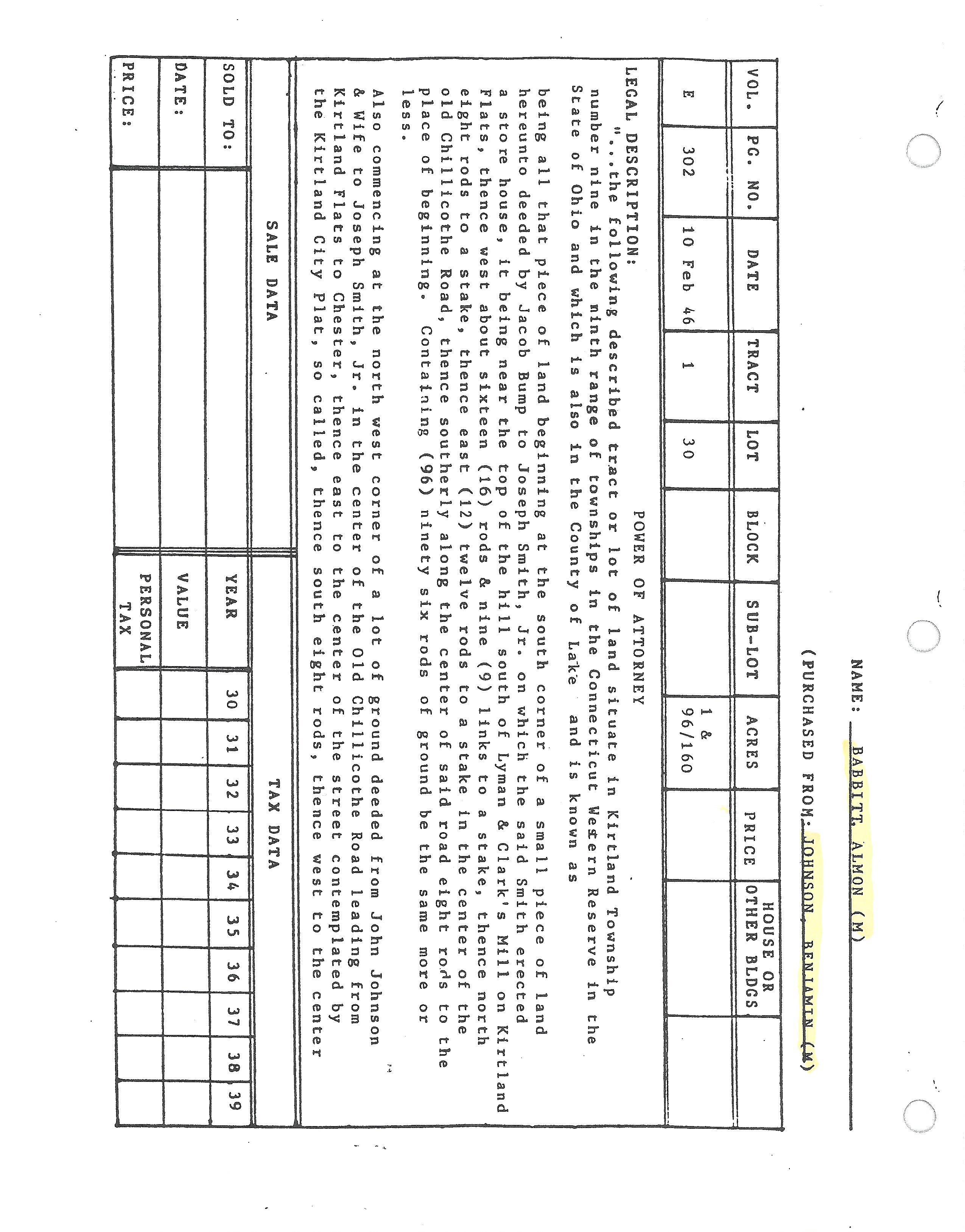 # 15. Lot 18 sub-lots D and J were bought by Seth Johnson in 1833. BF wrote that when Julia and her children arrived in Kirtland, “Some of our wagons and teams were traded for a home on what was then called ‘Kirtland Flat’ close to the schoolhouse.” These parcels are immediately to the north of the parcels which Joel had purchased. On 5 Jan 1835.shortly before Seth’s death, he sold this property to Samual H. Smith