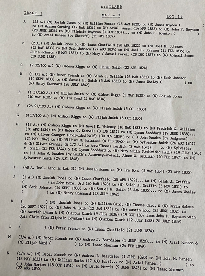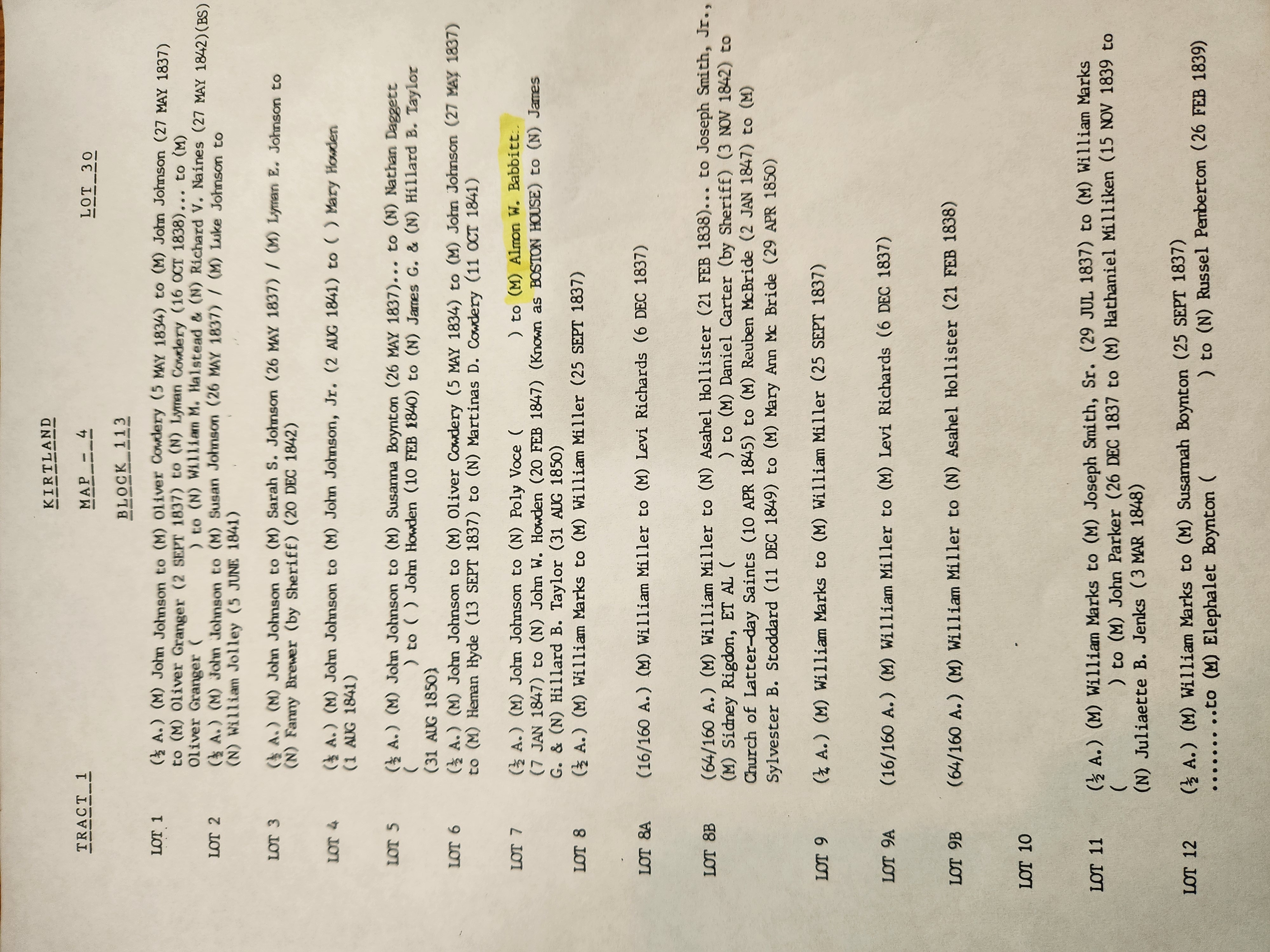 The following maps and land transactions are the result of a multiple year project headed by Gladys and Lyle Spencer Briggs to identify all of the land transactions of the members of the Church of Jesus Christ of Latter-day Saints in Kirtland, Ohio in the 1830s and 1840s.