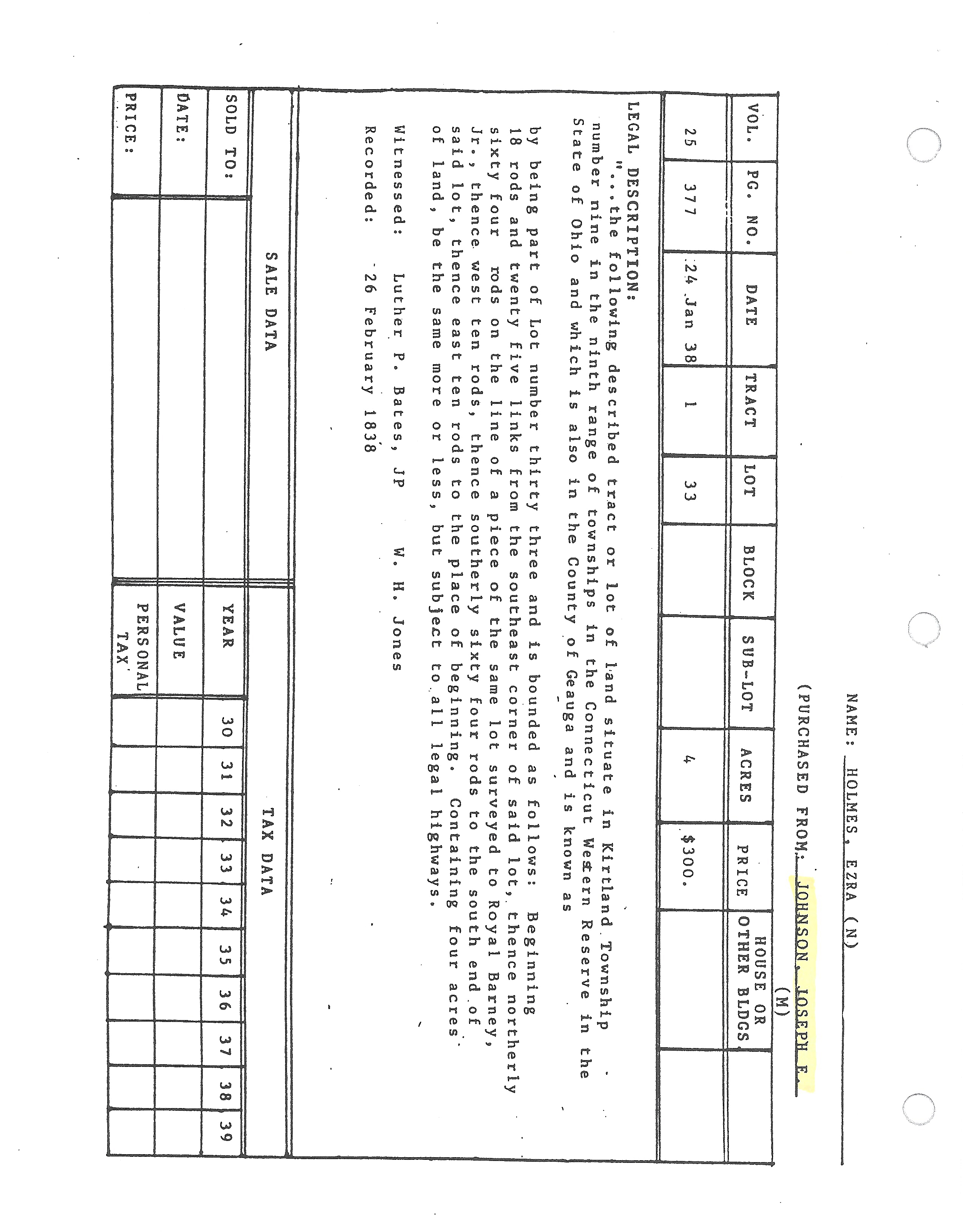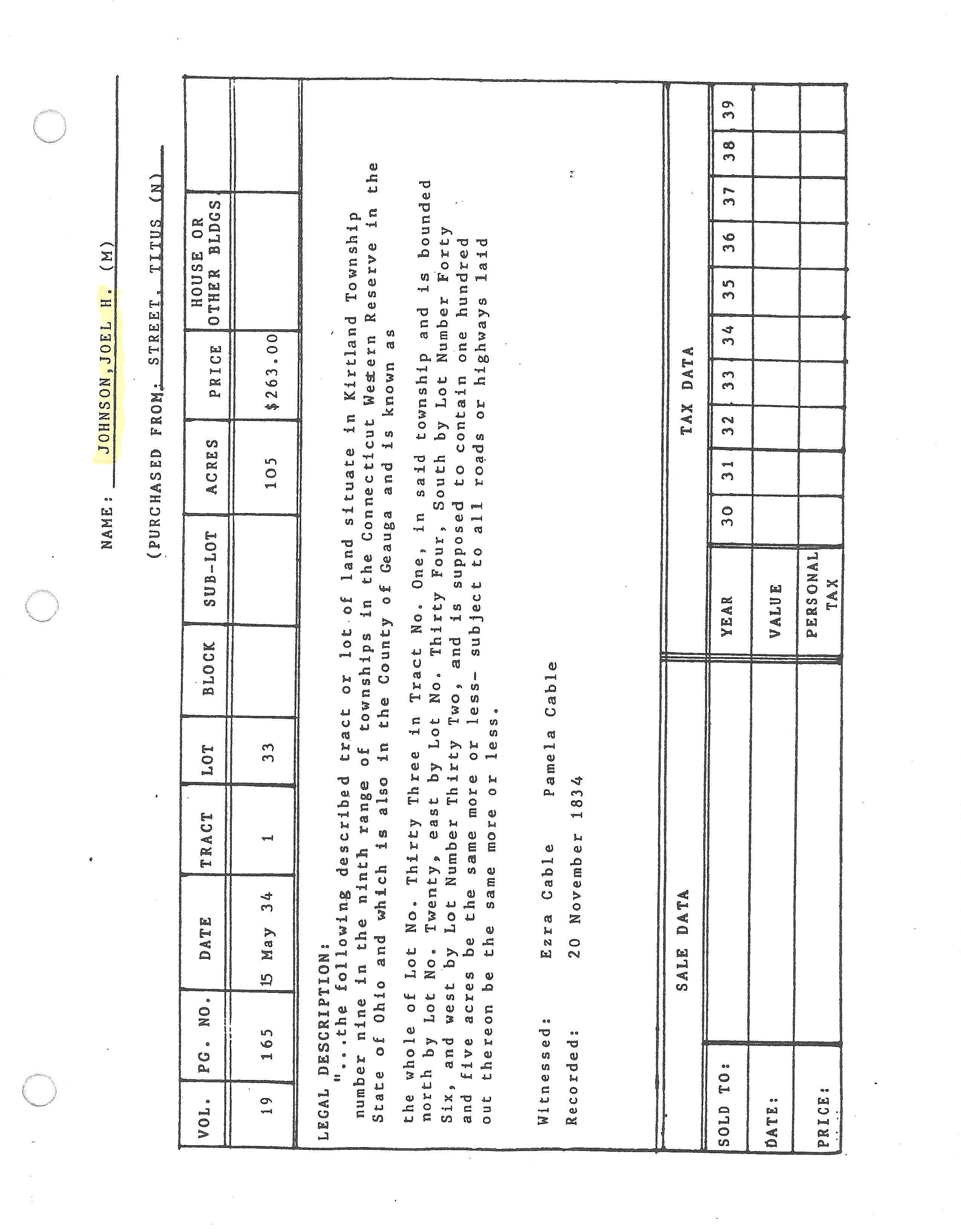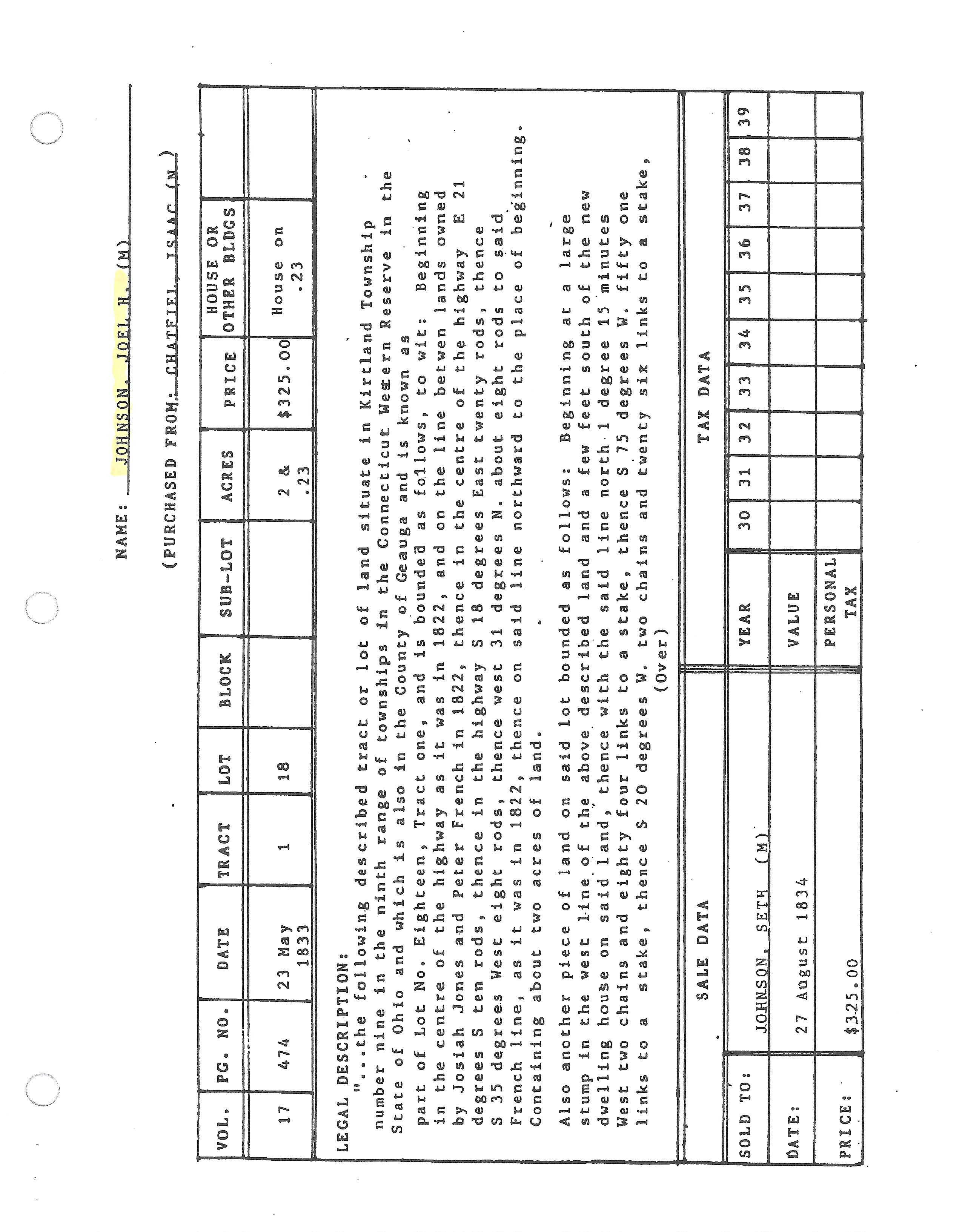 #17. Property of Joseph Ellis Johnson; Lot 33.sub-lot B. Joel Hills had subdivided this 4-acre parcel from his 105-acre lot and sold it to Edson Barney in 1834. Joseph bought it back in 1837. Julia and her unmarried children lived there until they left Kirtland.